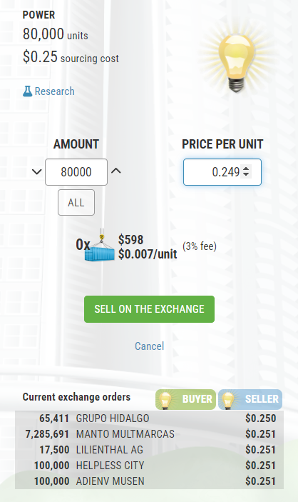 창고를 가보면 기본적으로 Power, Water, Transport가 쌓여있습니다. 이 중 Power을 전부 팔고, 다시 사고, 다시 팔고를 반복해서 Supplier Lv.4와 Buyer Lv.4 업적을 획득합니다.