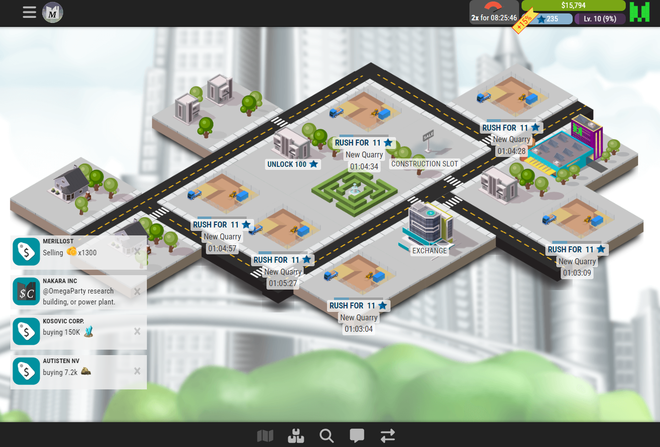 2번 목표의 스타팅 부스트에 대해 먼저 설명을 해보면, 스타팅 부스트는 첫 24시간동안 생산속도, 건설속도, 판매속도가 3배 또는 2배 증가하는 걸 얘기합니다. 스타팅 부스트는 게임 진도를 1~2일 정도 앞당길 수 있고, 초반 자본금 형성에도 도움이 됩니다. 그러므로 스타팅 부스트를 적극적으로 활용한다는 것은 24시간동안 최대한 건설이나 생산이 놀지 않게 만든다는 것을 의미합니다.